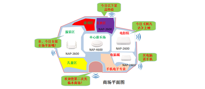 例如:在商場中心游樂場部署AP,提供最新的802.11ac的大帶寬接入,讓顧客在盡情游玩時,實時上網(wǎng)分享自己的游玩快照。在服裝區(qū)部署AP雙頻接入,實現(xiàn)購物人潮的大量接入。在電影院部署AP,天線內(nèi)置,不影響電影院的美觀。