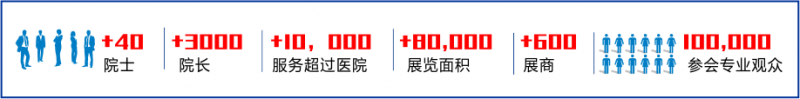 展覽面積:80,000㎡   預(yù)計(jì)展商:600家   預(yù)計(jì)專業(yè)觀眾:100,000人  參會(huì)兩院院士:40+    參會(huì)醫(yī)院院長:3000+   科研單位/科研團(tuán)隊(duì):3000+   高校醫(yī)學(xué)院教授、學(xué)生:20000+